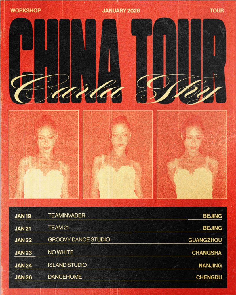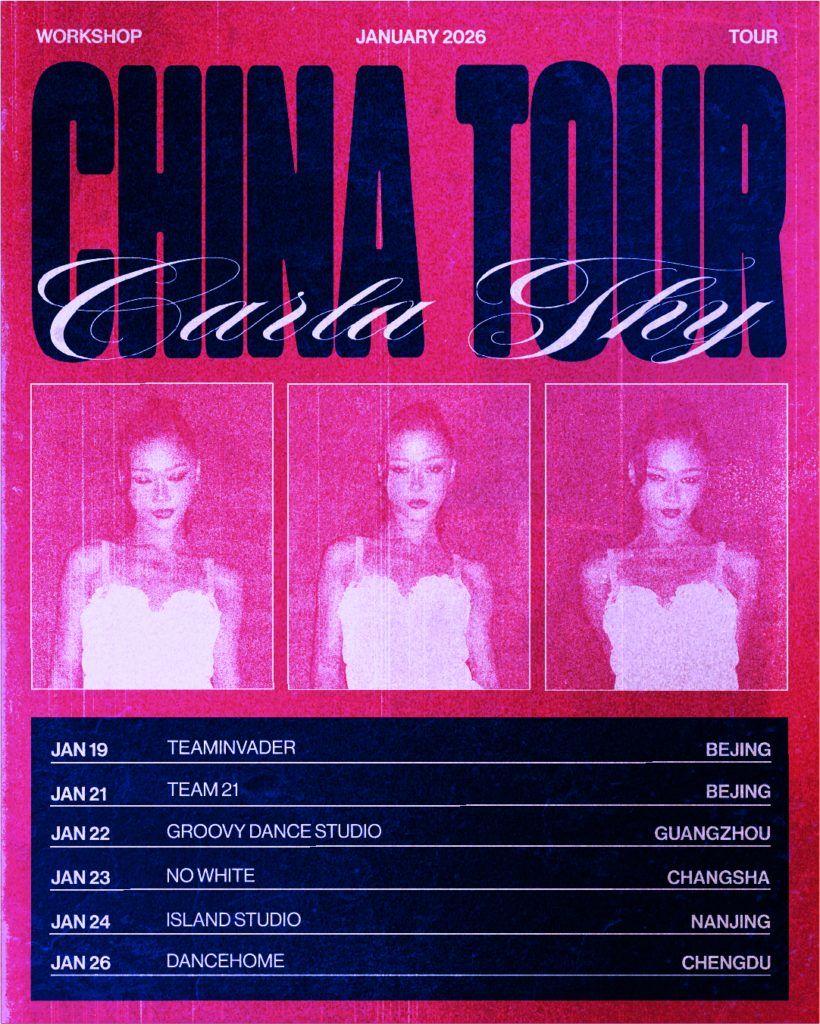 Anciennement championne en titre avec ses anciens crews, aujourd'hui danseuse professionnelle, elle s'est plus récemment illustrée durant les tournées de l'artiste Usher, Tiakola ou Matt Pokora. Conception graphique de la communication social media pour la tournée Chine 2026 de Carla Thy. Création d'une série de visuels de posts Instagram inspirés d'un style vintage y compris sur la retouche image. Contraste dans le choix des typographies entre une typo sans empâtement large et épaisse et une cursive fine et fluide. Cet ensemble met en avant l'énergie de la danse actuelle tout en rendant hommage aux codes graphiques du passé. Projet professionnel.